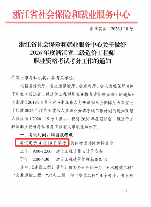 转发浙江省社会保险和就业服务中心关于做好2026年度浙江省二级造价工程师职业资格考试考务工作的通知